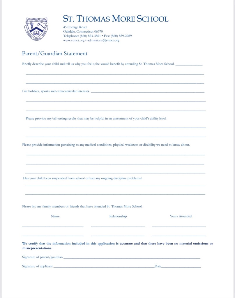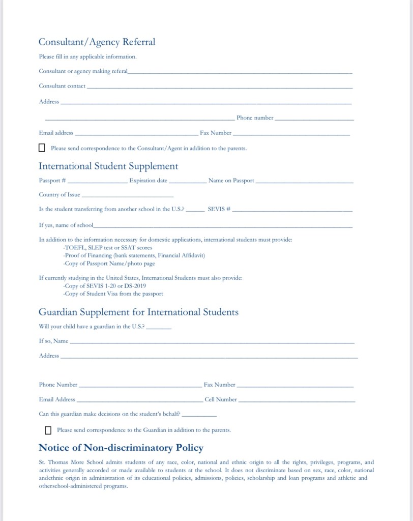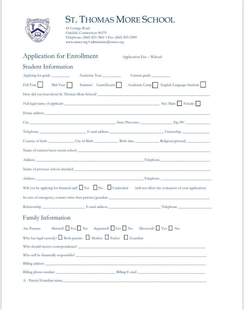 St. Thomas More School の入学願書